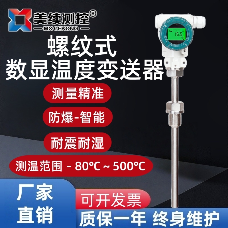MX-WD-06美阅智能数显温度变送器是采用高精度的进口PT100铂电阻作为感温元件,再通过电路处理模块将电阻信号转换成标准的4-20mA电流信号,美阅智能数显温度变送器作为一体化温度变送器在工业现场直接输出 4~20mA 信号,这样既省去昂贵的补偿导线,又提高了信号长距离传送过程中的抗干扰能力,同时又增加LCD就地显示功能,可以有效地使现场工作人员直接看到有效数值变化,能够有效地采取应对措施。变送器部件精度高、功耗低,使用环境温度范围宽,工作稳定可靠。而且由于采用硅橡胶密封结构,变送器耐震、耐湿,适宜于恶劣现场环境中使用。