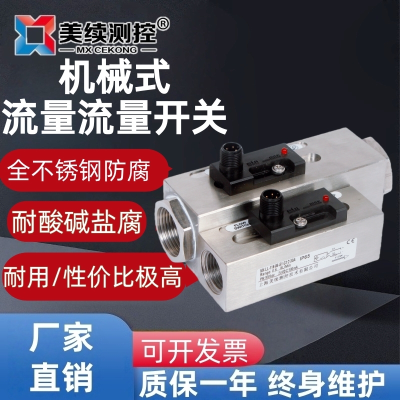 机械 流量开关在工业自动化飞速发展的当下,流量监测已经是非常成熟的一项技术,目前由于流量计的高昂成本使很多小型自动化领域难以有效地监控流量的大小,上海美续MX-LL-116-06系列流量开关是一种及其方便,简易流量监测仪器,输出定点的开关量信号从而起到控制流量的大小。